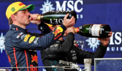 Pilote du jour, Max Verstappen remonte depuis les stands jusqu'au podium
